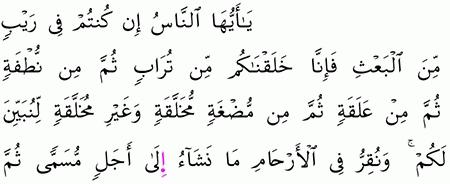 ي ا أ ي ه ا الن اس إ ن ك نت م ف ي ر ي ب م ن ال ب ع ث ف إ ن ا خ ل ق ن اك م م ن ت ر اب ث م م ن ن ط ف ة ث م م ن ع ل ق ة ث م م ن م ض غ ة م خ ل ق ة و غ ي ر م خ ل ق ة ل ن ب ي ن ل ك م.